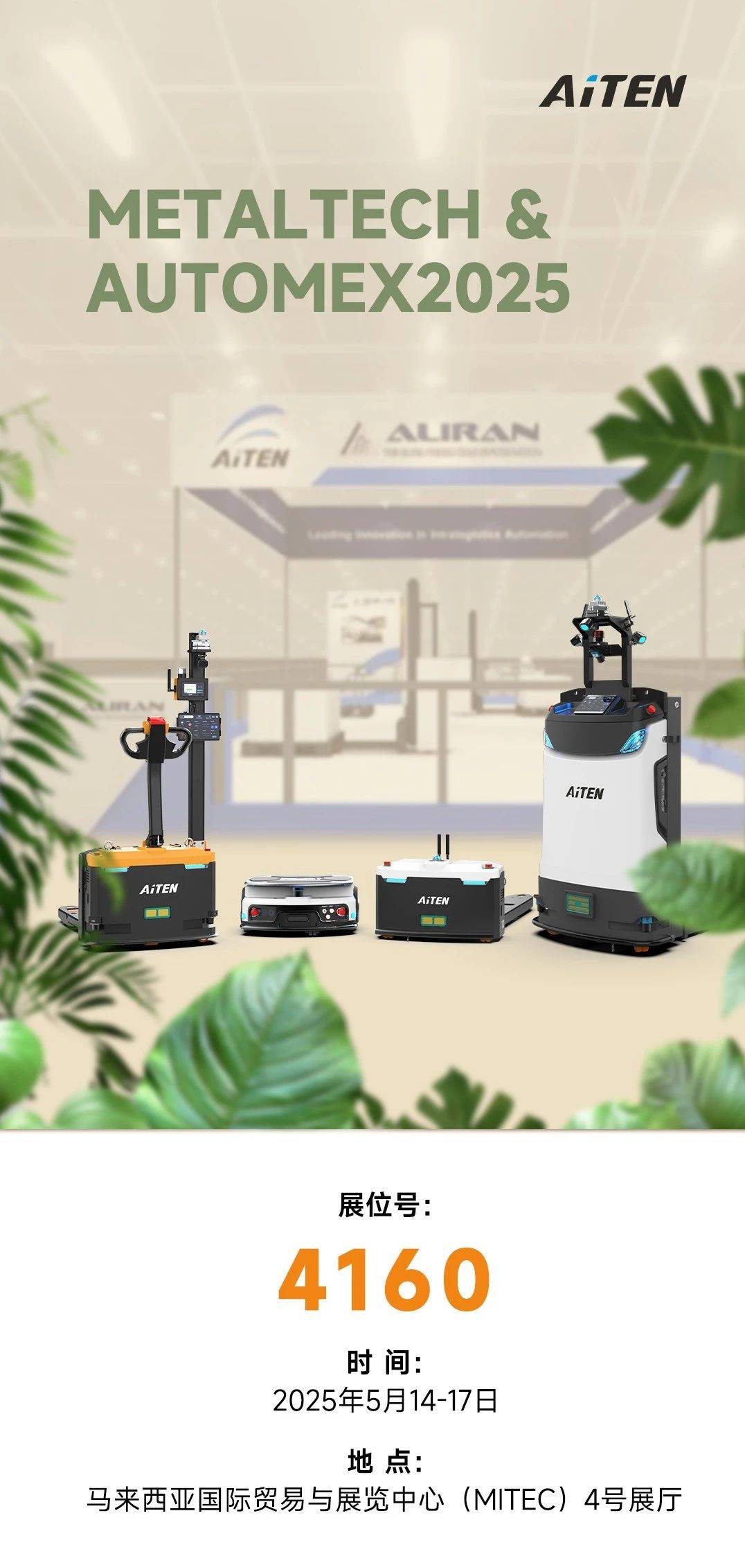 倒计时启动!诚邀您参与现场动态演示,jinnianhui.comAiTEN将携搬运移动机器人AM15,MP10,APE15,TT15惊艳亮相(2025.5.14-17)。